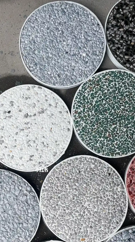 骨料:天然河卵石 / 海卵石,粒径通常为 3-6mm(小八厘),常见颜色有芝麻白、米黄、灰色等